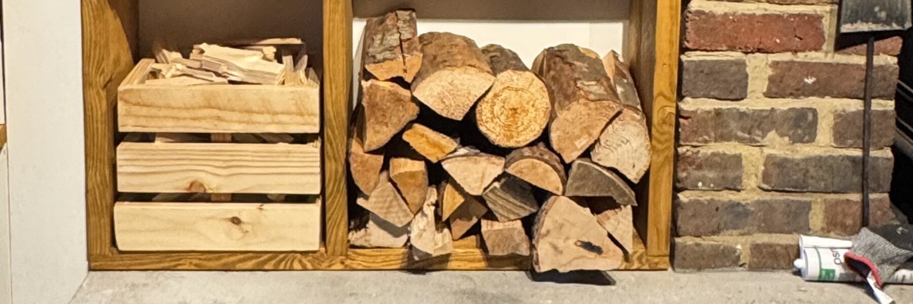 I can store around one large bag of Kindling in the basket (which for me is about a week to two weeks worth) and around 40 – 50 mixed logs which, give or take is about 1 week of use – so not too shabby.