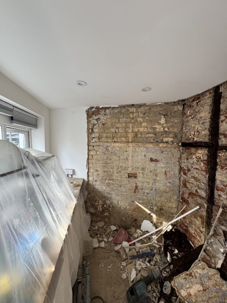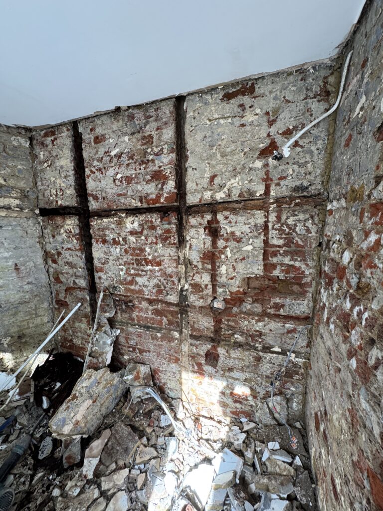 Walls needed to be taken back to the brick (I had already ripped out all the old electrics). The company even found the original wood framing to the cottage – which had rotted away. So they needed to replace with concrete blocks.