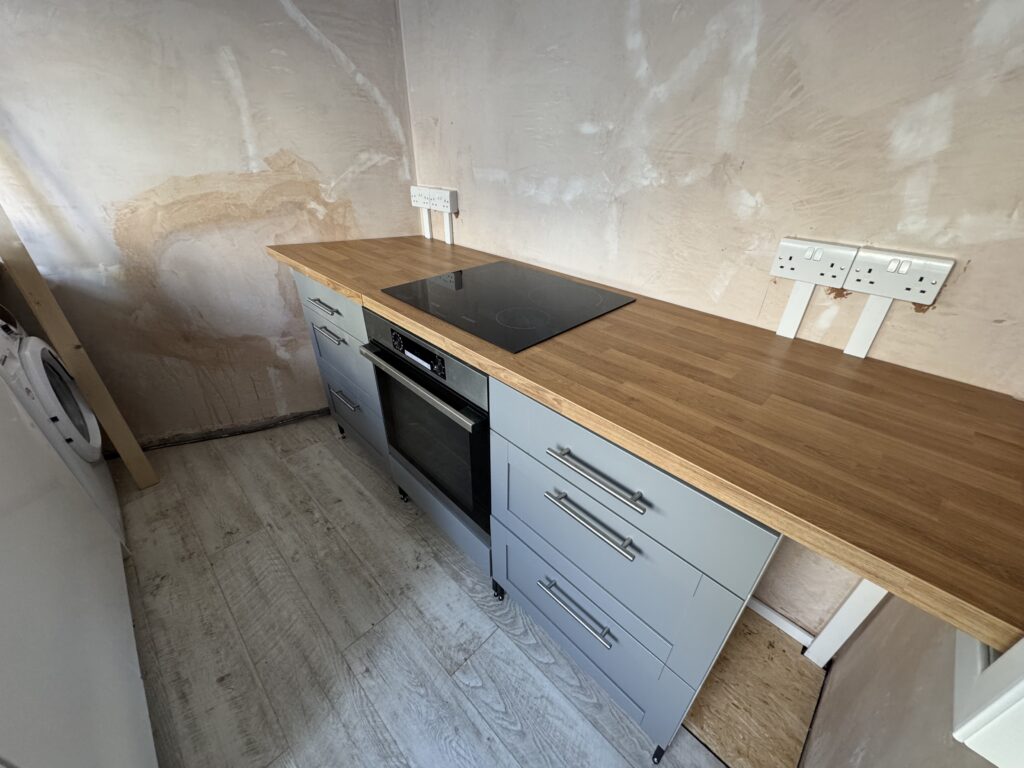 The photos below are taken from a little further on in the process as you will be able to see that there are sockets present – and clearly I had also cut the counter top both into place and the hole for the hob. I didn’t get any photos of the oven and hob installation and wiring as, to be frank that was fiddly.