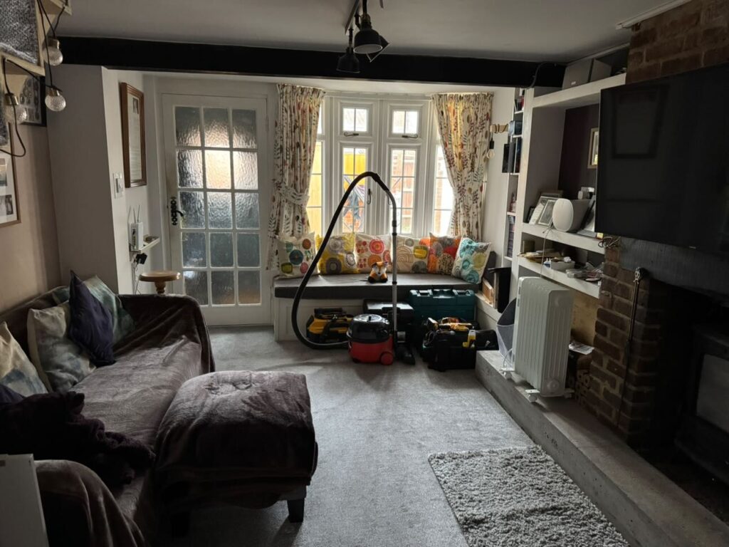 Below is a shot of the living space before the work – I know that it actually looks kinda good, but it’s a bit of a cheat really as prior to this photo (which was on a tidy up day) it looked like a beach on D-Day!